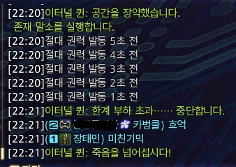 사유:보스 피 1.35펀가 남앗길래 아 그럼 뭐 중간에 죽겠지 하고 기믹처리 게을리했는데 안죽어서 장판 다처맞고 사망